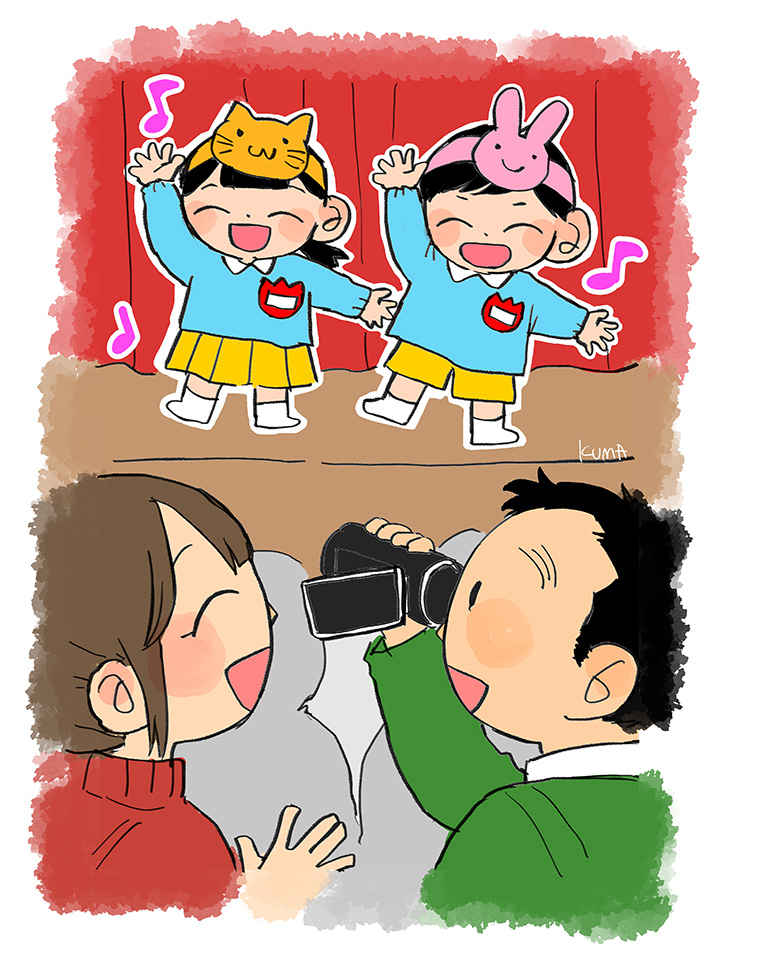 当日、始まる前にとなりのお父さんが「私、去年失敗したんです。息子に『お父さんカメラもってるから、お父さんをさがして、手をふってね』と言ったんです。すると、息子のクラスの番になって、みんな歌っておどり始めたにもかかわらず、うちの息子だけ最初から最後まで私をさがしてばっかりで、結局見つけることができず、ぜんぜん歌ってくれなかったんです。余計なことを言ってしまいました」と教えてくれました。私も息子に同じことを言っていたため、「あちゃー」と思い、歌ってくれるか不安になりました。